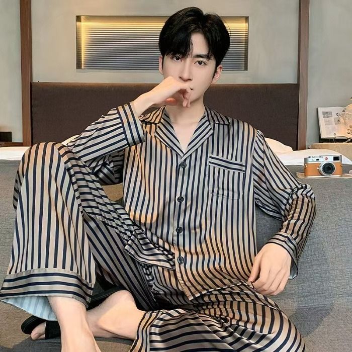 2025 New Spring And Autumn Men's Pajamas, Ice Silk Pants, Long Sleeves, High End Ice Silk Home Clothes Set