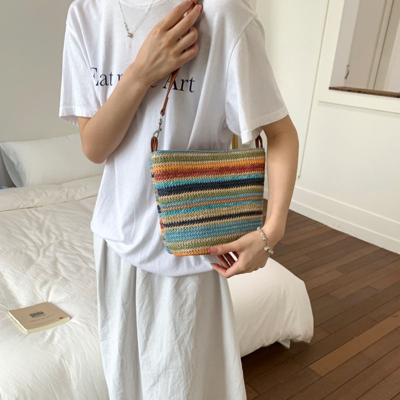 Autumn Winter Rainbow Striped Straw Underarm For Women 2025 New Niche Simple Casual Beach Shoulder Bucket Bag