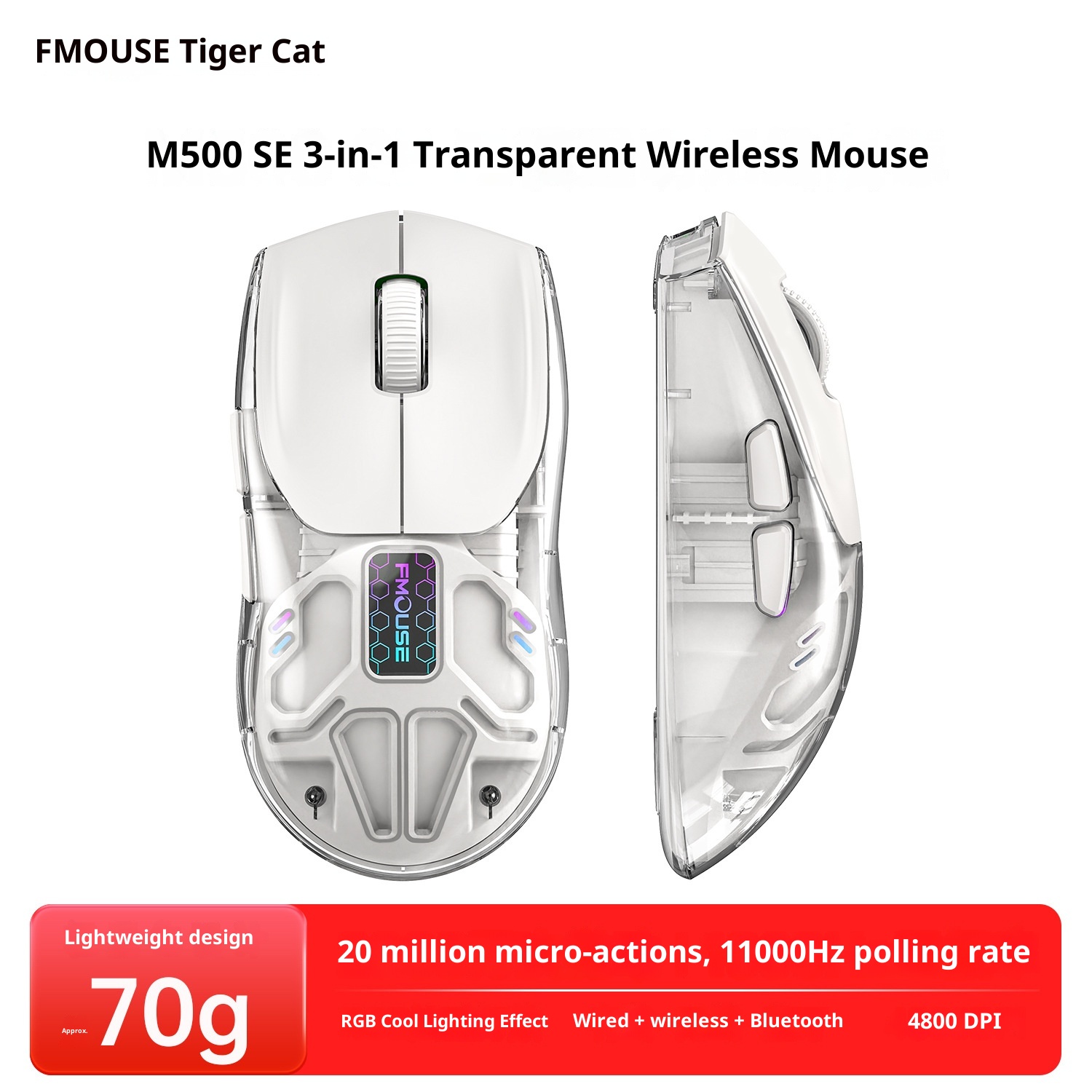 Brand:FMOUSE/Tiger Cat,Item Number:M500,Time to market:2025.8.29,Type:Gaming Mouse,Mouse size:Rat ≥120mm,Connection method with a computer:Wired + Bluetooth,Compatible Models:Desktop Computer,Optical resolution:4800dpi,Number of Buttons:7,Interface:Bluetooth,Wireless Transmission Frequency:2.4GHz,Does it support ergonomic design?:Support,Adjustable resolution:Six-speed,Operating distance:10m,working method:Optical,Direction of the scroll wheel:Four-way roller,Product Dimensions:124x63x38mm,Product weight:70g,Custom Printing:Sure,After-sales service:Storefront Three Guarantees,Package contents list:Mouse + Receiver + Charging Cable,Color:Graphite Black, Space Gray,We have authorized private labels available:yes,Is it exclusively for cross-border export supply?:No,Customizable:Support,Power supply mode:Comes with a charger