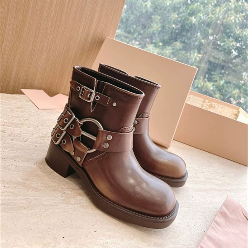 Cowboy Metal Buckle Ankle Boots 2023 Women's New Spring Summer Genuine Leather Mid Heel Slip-On Trend