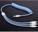 Product Name: Car Triple-in-One Spring-Loaded Expandable Fast Charger Cable Product Description: This car triple-in-one spring-loaded expandable fast charger cable is a multifunctional charging solution designed for modern travelers. Made of durable nylon braided cable, TPE sheath, and ABS casing, it not only provides a stylish appearance but also ensures excellent durability and resistance to bending, making the cable less likely to break. Key Features: Product Colors: Available in blue and gray to meet the personalized needs of different users. Product Material: A combination of nylon braided cable, TPE sheath, and ABS casing enhances the cable's durability and flexibility. Product Length: The expandable design can stretch up to 1.8 meters, with a recommended usage length of no more than 1.5 meters to protect the cable. Applicable Interfaces: Supports Lightning, Micro, and Type-c interfaces, compatible with mainstream charging devices on the market, and supports super fast charging up to 100W. Technical Specifications: Resistance to Bending: The unique solid cable interface design is not afraid of frequent bending and rejects the possibility of breaking. Freedom to Stretch: The cable can be long or short, flexibly adapting to different occasions and keeping the car tidy and organized. Super Fast Charging: Supports super fast charging capabilities up to 100W, significantly reducing charging waiting time. (Note: This feature requires the phone and charger to support it.) Multi-Device Charging: Can charge three devices at the same time, achieving low-temperature efficient fast charging without fear of low battery. (Note: Requires use with a charger of 100W or more.) Usage Scenarios: Car charging, providing continuous power for devices during the journey. For home or office use as a universal fast charger cable. Customer Reviews: Users generally believe that this fast charger cable is cleverly designed, easy to use, has high charging efficiency, and is an ideal choice for travel and daily charging. Reasons to Buy: By choosing this car triple-in-one spring-loaded expandable fast charger cable, you will enjoy a fast, efficient, and tidy charging experience. Whether it's during long drives or daily use, it can meet your needs for multi-device charging. Note: To extend the product's service life, please use this product within the recommended stretching range.