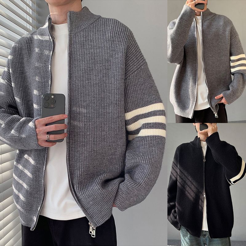 Three-Stripe Knitted Sweater Cardigan Men, Stand Collar, Loose Casual For Autumn And Winter